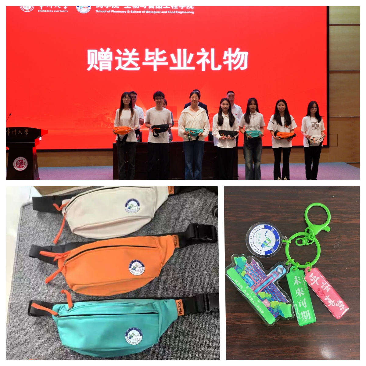 制药211徐昊思、生工211朱沛雯、药学22研王妮妮分别作为本科生和研究生毕业生代表发言,他们深情回顾在校的点点滴滴,感谢学校、学院的精心培养。药学212班班主任黄晓佳老师作为教师代表发言,希望同学们勇敢进取,勇担责任,放平心态,走好以后每一步。在赠送毕业礼物的环节,学生代表们收到了学院精心准备的毕业礼物:一个胸包,装满对常大的回忆,轻装奔赴未来的旅途;一套定制的钥匙扣,既可作为包包挂件,每一个都可单独拆开作新的钥匙串,祝愿所有的毕业生平安喜乐,未来可期。